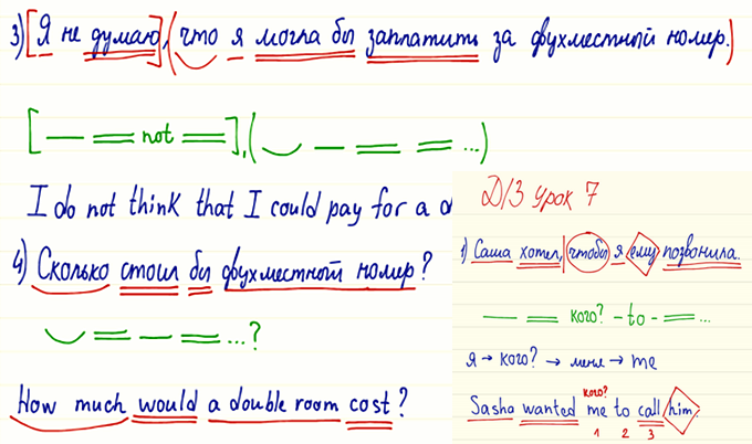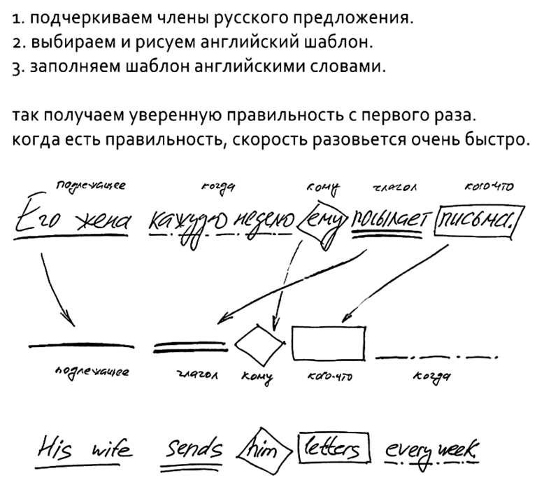 - когда я говорю вам СНАЧАЛА ПИСЬМЕННО рисовать полоски, потом над ними надписывать слова, то это мы делаем с прицелом на устное говорение. далее мы МЫСЛЕННО будем рисовать эти полоски и над ними расставлять слова. тогда не промахнемся.